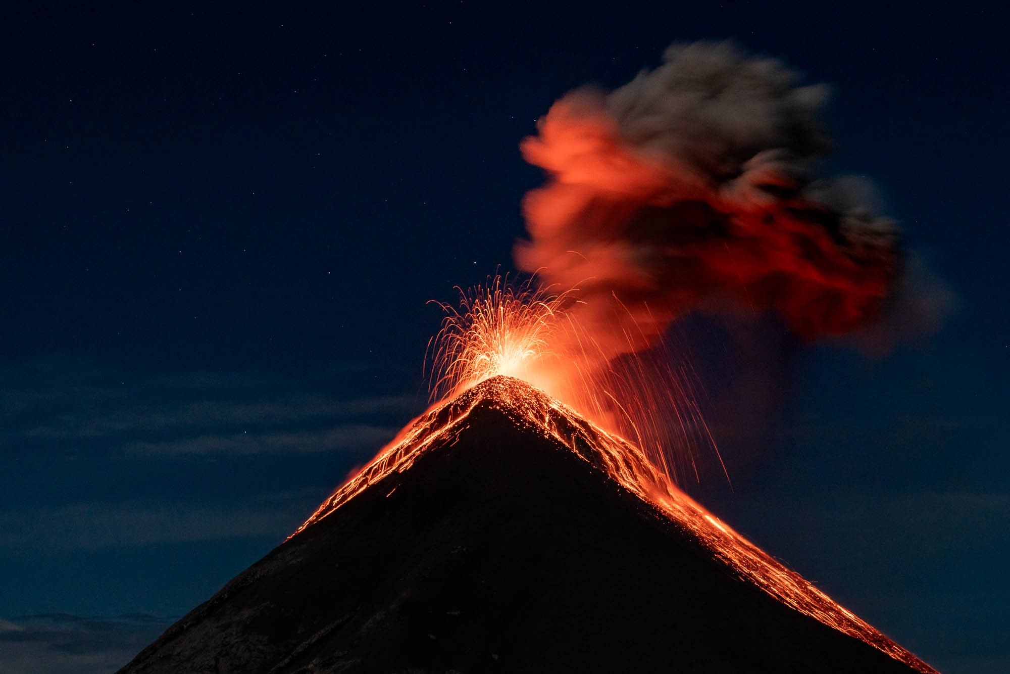 Let’s start with the basics. Acatenango and Fuego are twin volcanoes located near Antigua, Guatemala. Fuego is one of the world’s most active volcanoes — erupting almost constantly every 15 to 20 minutes. You can’t safely climb Fuego's crater, but you can hike up Acatenango and watch Fuego erupt from across the valley. It’s mind-blowing.